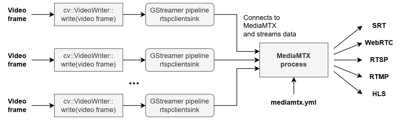 The VStreamerMediaMtx C++ library provides RTSP, WebRTC, SRT (optional, not tested in version 1.1.1), RTPM (optional, not tested in version 1.1.1) and HLS (optional, not tested in version 1.1.1) video streaming without audio. The library inherits interface from VStreamer. The library depends on: OpenCV (version >= 4.5) library (running GStreamer pipeline and video scaling, linked, Apache 2.0 license), GStreamer (video encoding and streaming to mediamtx, run as external process by OpenCV, not included in code), mediamtx (provides video server, run as external process, not included in code, MIT license), VCodec (not used, defines video codec interface, source code included, Apache 2.0 license), VOverlay (defines video overlay interface, source code included, Apache 2.0 license), FormatConverterOpenCv (provides methods to convert pixel formats, source code included), ConfigReader (provides functions to read / write JSON files, source code included) and ChildProcess (provides functions to run child process, source code included). The library supports changing RTSP parameters such as: RTSP server port, IP, stream name, user name, password etc. The library works frame-by-frame and accepts video frames in formats: RGB24, BGR24, YUYV, UYVY, GRAY, YUV24, NV12, NV21, YU12 and YV12. Principle of operation: when user sends frame (call sendFrame(…) function) the library copies video frame to internal buffer. After initialization the library runs internal thread. Internal thread is taking new frame according to FPS (set by user in parameters). After taking new frame the library does frame scaling (according to scaling mode if input frame size different from video stream size) and put overlay information (if overlay engine is initialized by user). After preparing frame the library runs (once) GStreamer pipeline and sends video frame to it. GStreamer pipeline includes video encoder (software or hardware, set by user). GStreamer pipeline streams data to external process mediamtx (user should run it in advance or using auto run provided by the library) which provides video server service for clients. All instances of the library should use the same RTSP port, user name and password, RTSP multicast IP and port. The version 1.1.1 of the library support H264, H265 and JPEG video encoding on CPU, Intel GPU and Nvidia Jetson platforms using GStreamer. Bellow the working principle: